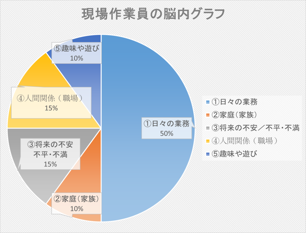 左のグラフはあくまで当社調べの内容となりますが、残念なことに30%近い割合が④人間関係③将来の不安や不平・不満などの業務を阻害する考えによって脳が占められています。